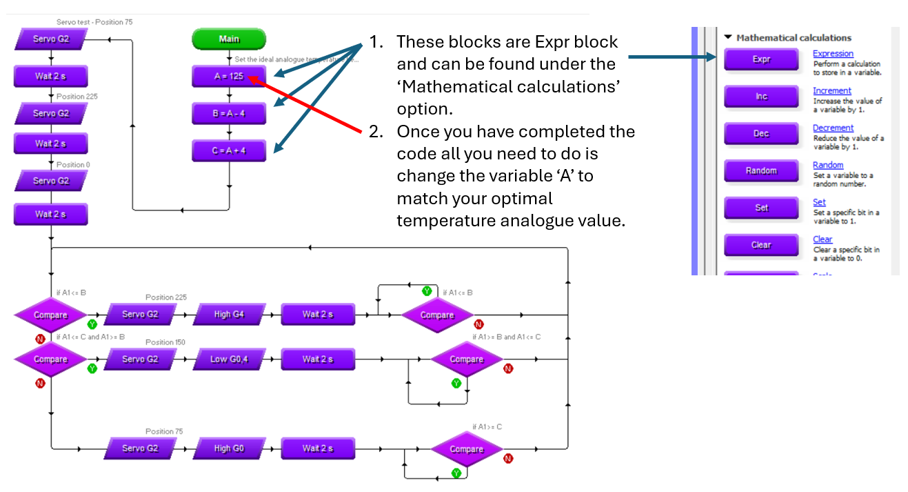 - To fix this, we add the compare decision after the motor has moved and set it to stay in the compare loop until the analogue value changes to the next setting. This will stop the servo from constantly trying to move to the same position.